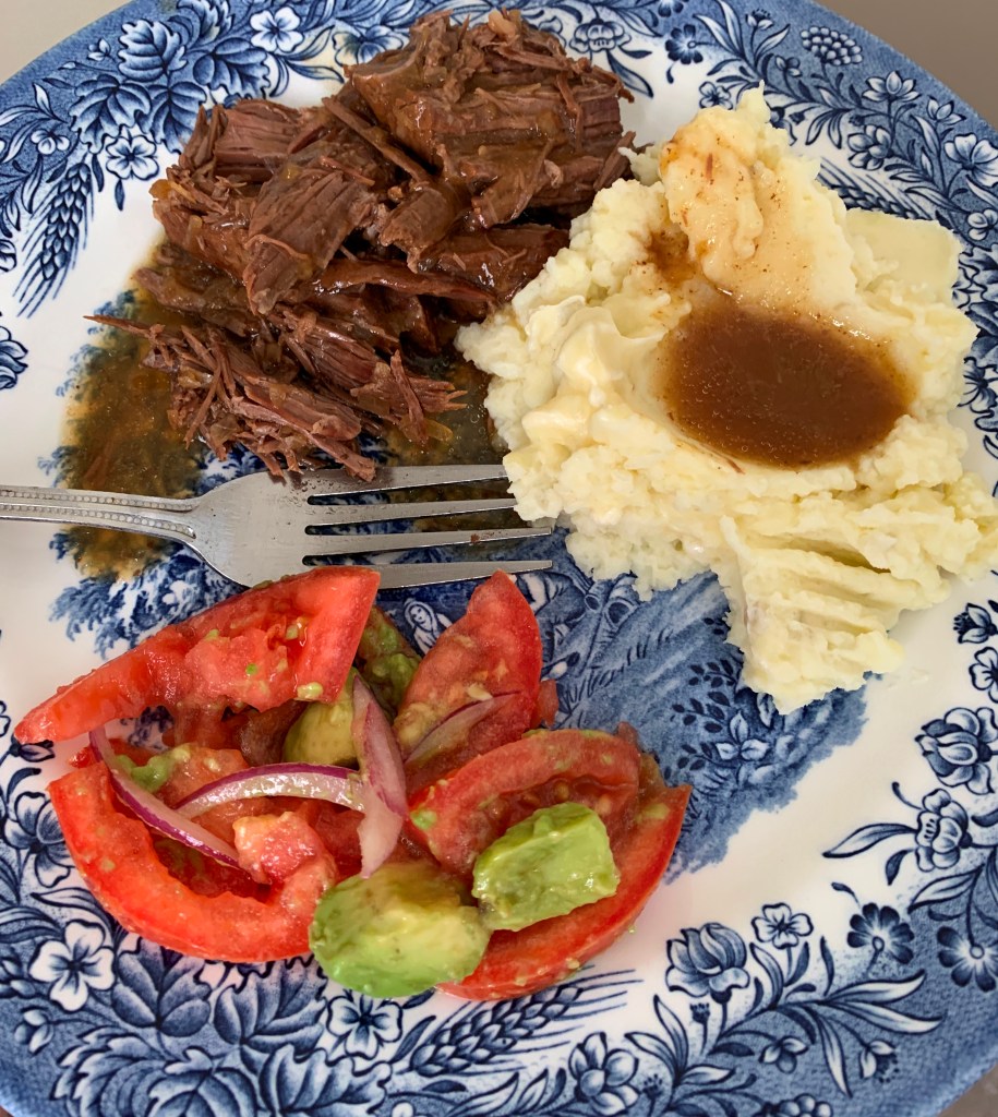 - Beef Roast (done in the slow cooker with dry onion soup mix and beef broth)/Mashed Potatoes/Tomato, Avocado and Onion Salad