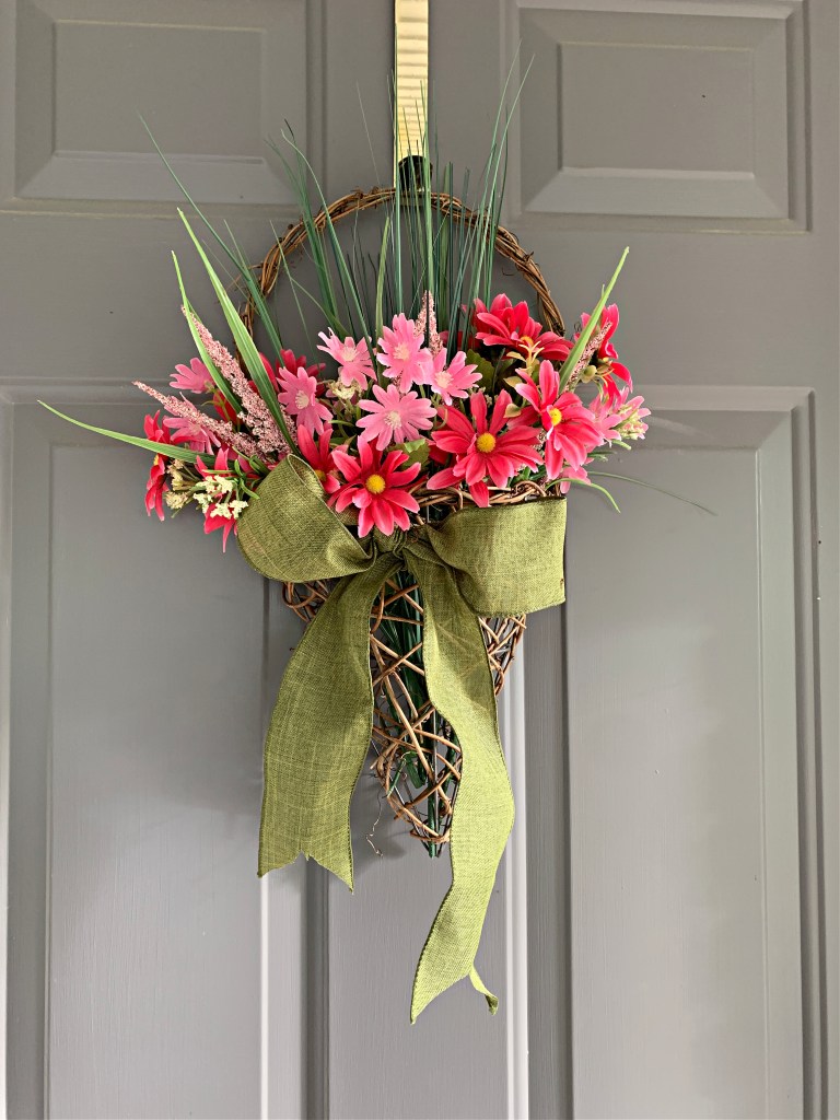 The wired ribbon and bow (also from Dollar Tree) is secured on the basket with some hidden jute, so there’s not even a need for the hot glue gun! This door is opened and closed often, but the basket is full enough that the flowers haven’t shifted much at all.