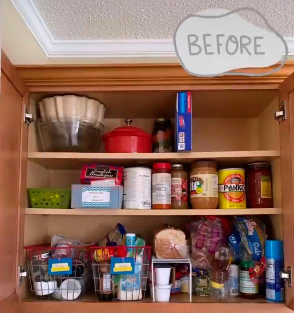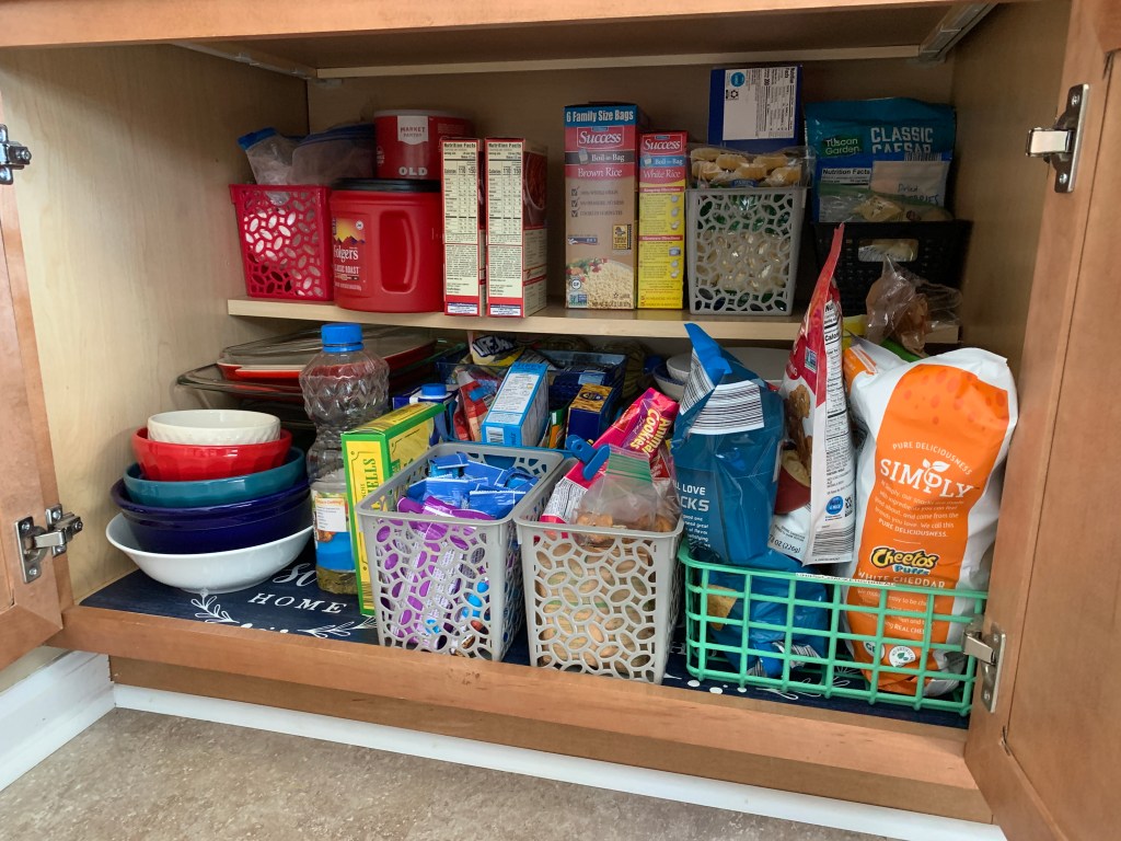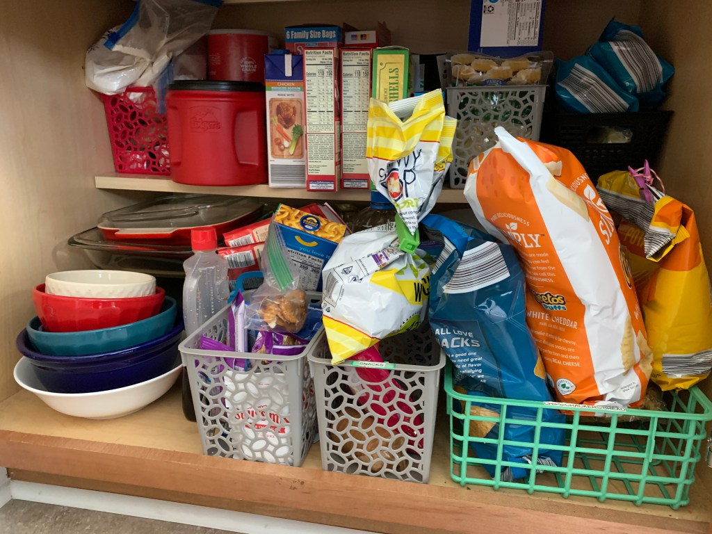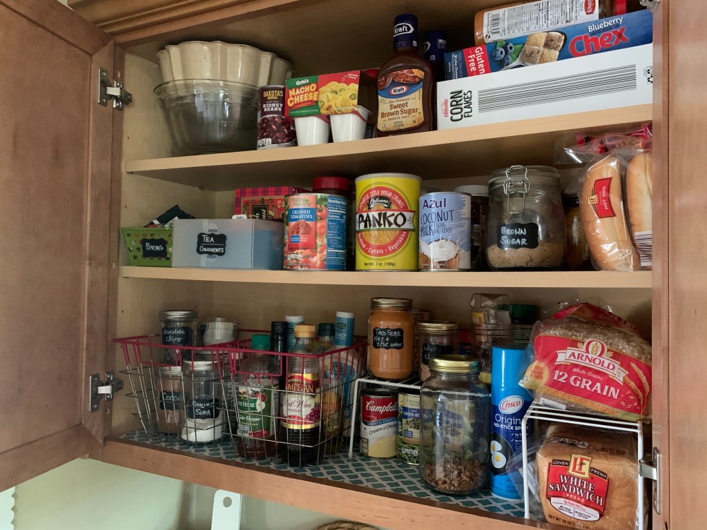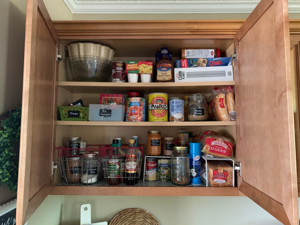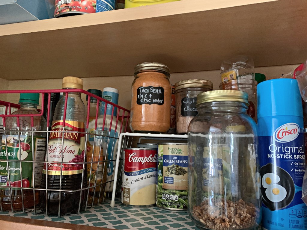 - Make sure you can easily access the things you use often. That’s why the tall bottle of Crisco spray is in the front – I use it all the time and don’t want to move a bunch of stuff when I need it.