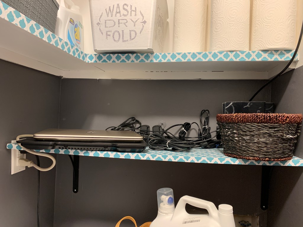 Thankfully, my husband had a grand idea to thread the cords through the empty space in the wall behind our TV (inspired I believe by this post), and to store the computer accessories on a shelf in the laundry closet which backs up to the TV wall.