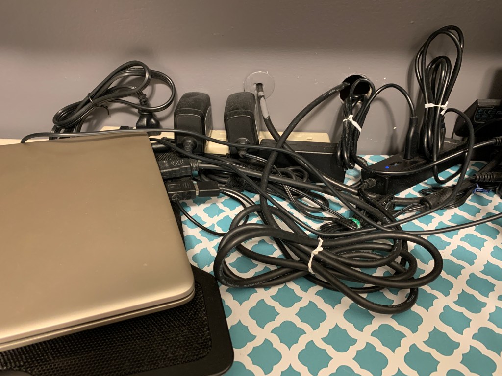 Here’s what you see in my laundry closet, on the other side of the wall from the TV. I couldn’t be happier that this mess of cords is behind closed doors!