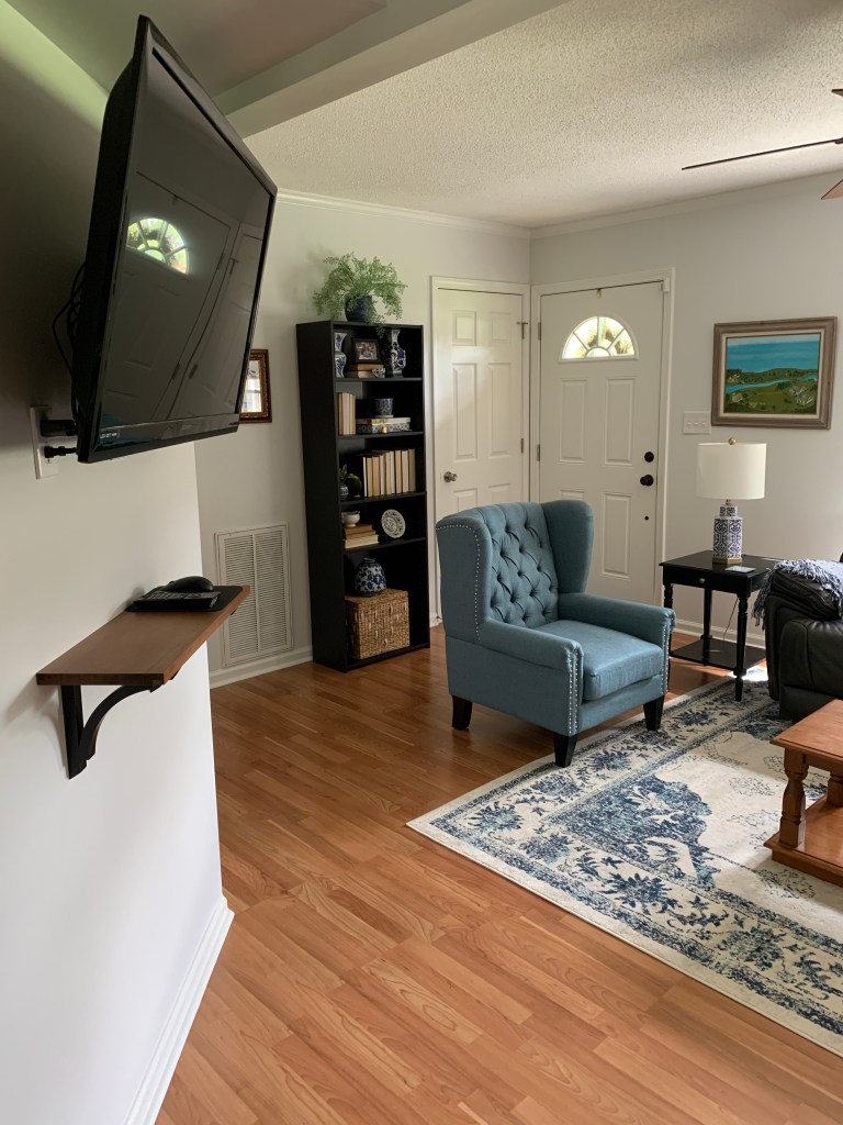 We do keep the mouse and remotes on the shelf in front of the TV simply for convenience. I used to hide them in the end table drawers, but I decided that life is too short to constantly be digging them out of there. LOL.