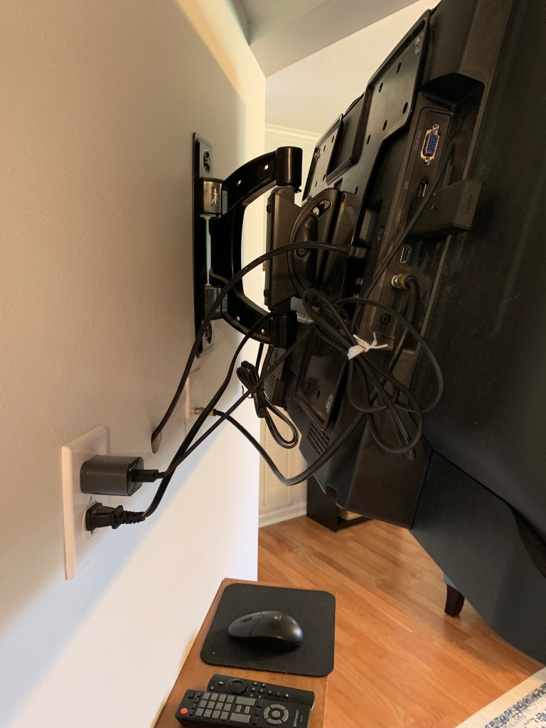 Mounting a flat screen on the wall always means you have to do something with the cords. In our case, our TV also has a computer, mouse and two hard drives attached to it. It makes for incredible TV viewing options, but it makes an ugly mess.