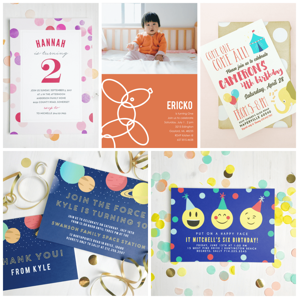 How cute are these kids birthday invites? Basic invite has specific designs for first birthdays and even custom sweet 16 invitations.