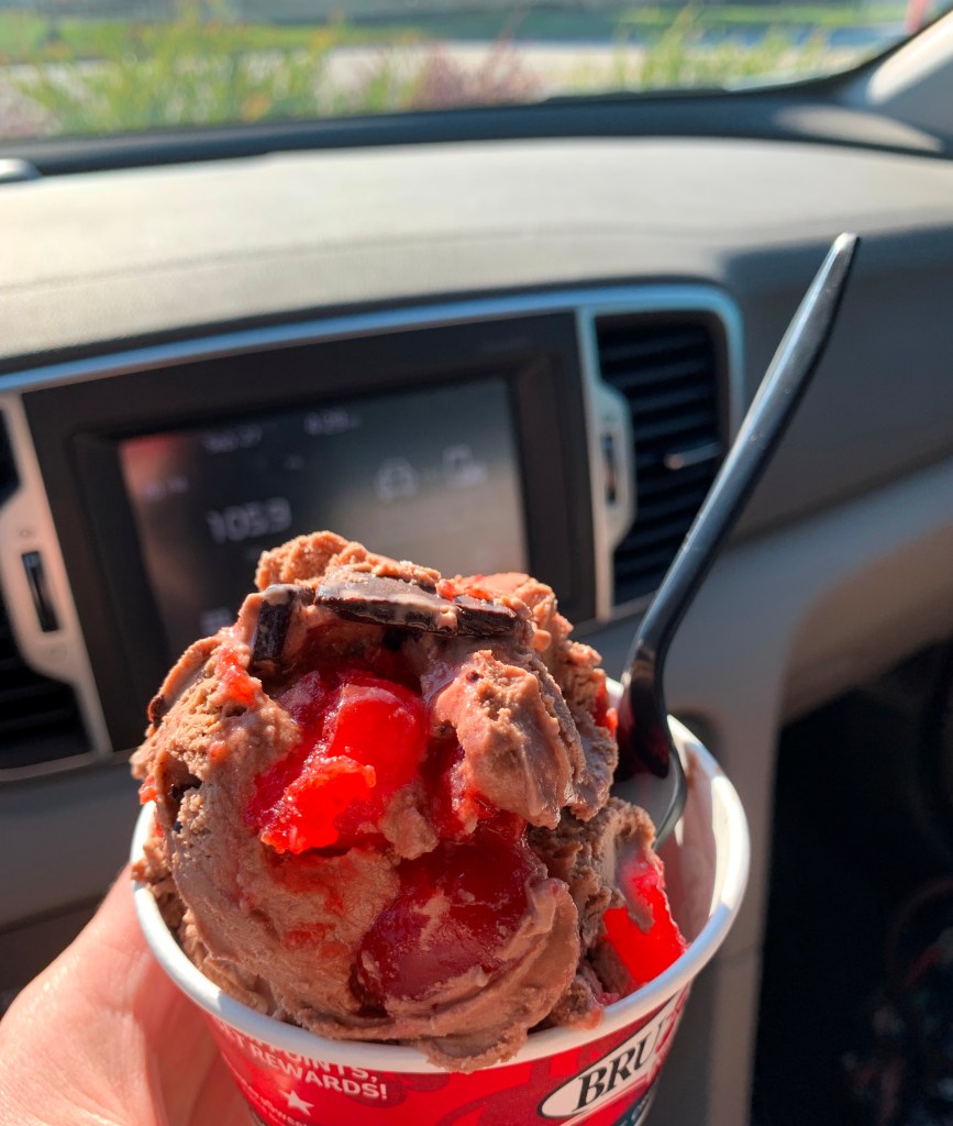 - Still working my way through the free birthday dessert deals! This was Brusters (my fave!) Chocolate Cherry Chunk. 🙂