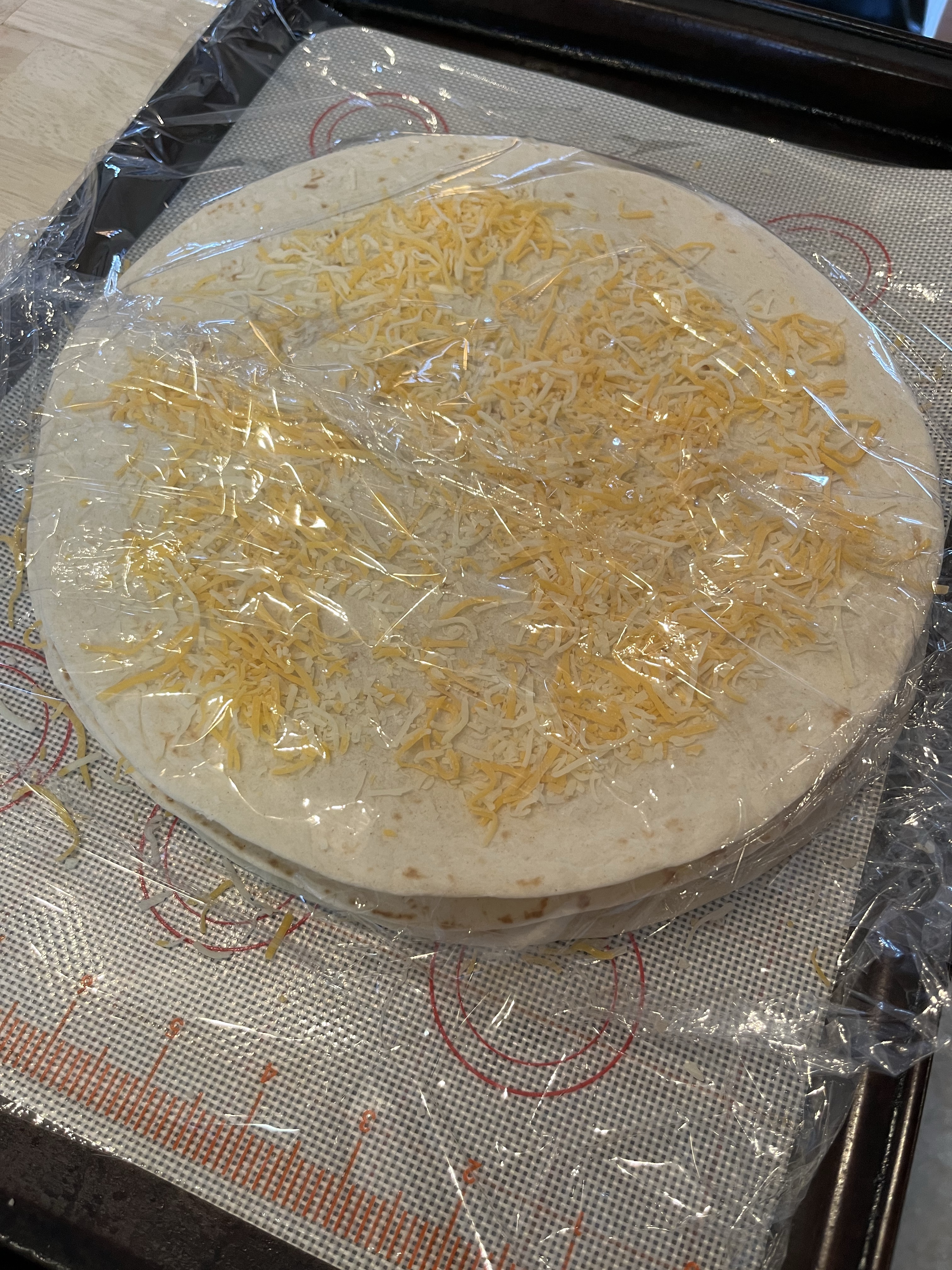 The double decker quesadillas can be completely assembled early in the day. I like to cook the meat, assemble the quesadillas and keep them on the cookie sheet in the fridge. When it’s time for supper I just slide the pan in the oven and prep the toppings while I wait for the cheese to melt.