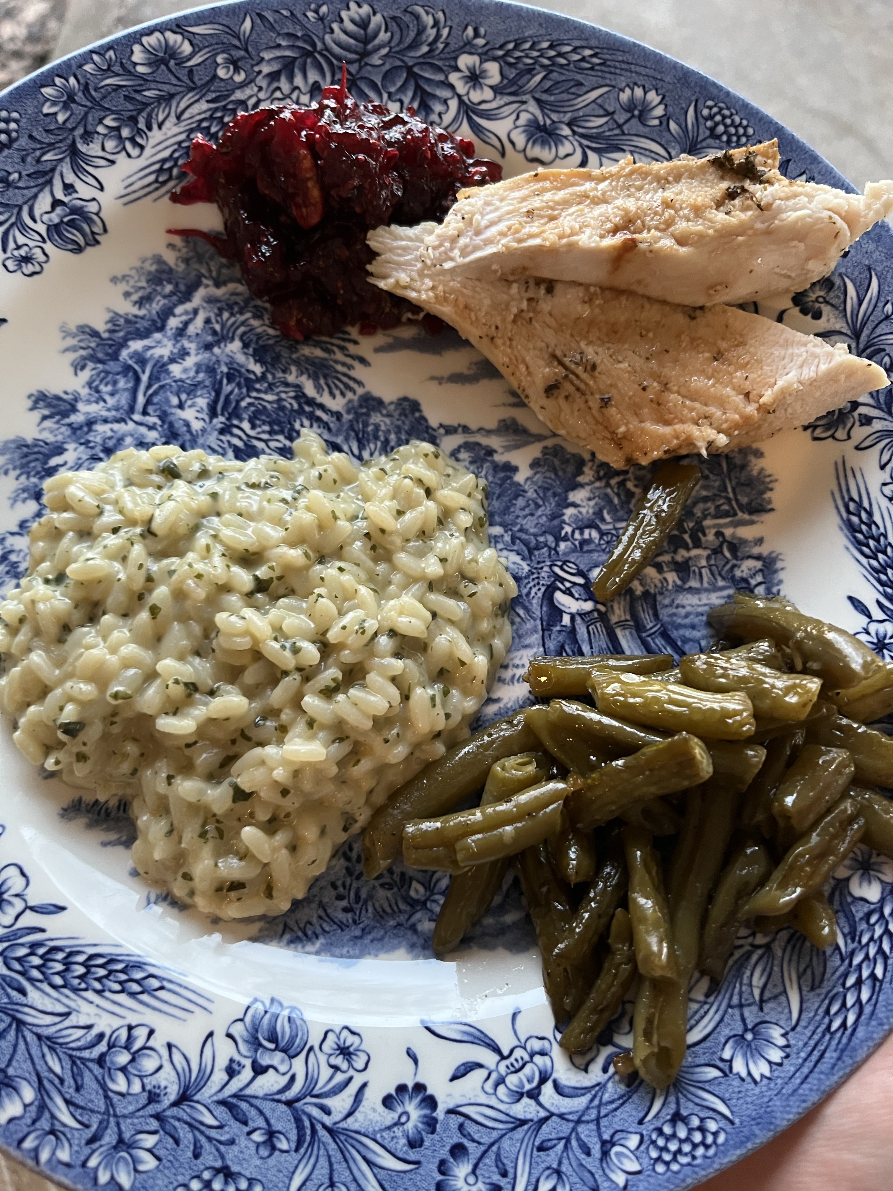 - Herb Roasted Turkey Breast/Cranberry Sauce/Garlic Risotto/Southern Green Beans