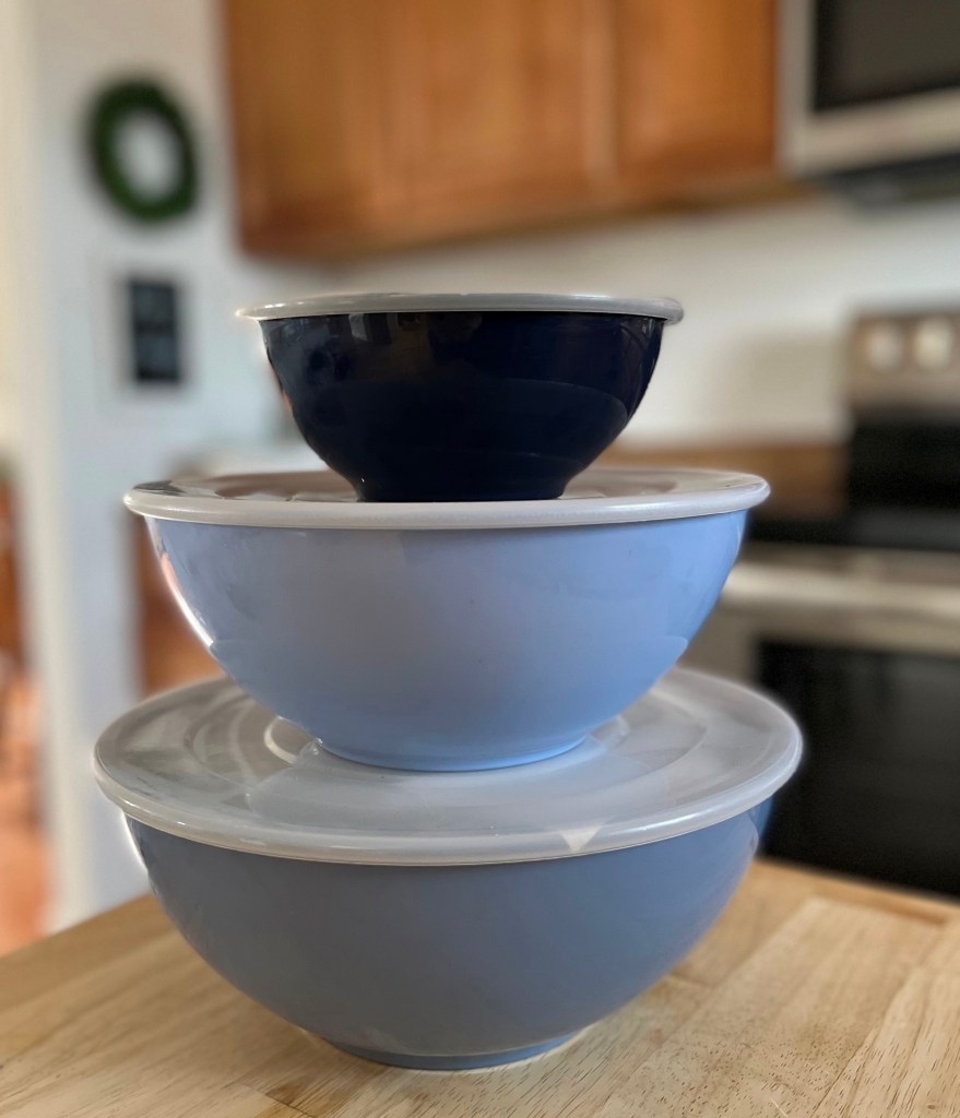 5 Piece Mixing Bowl Set with Lids: These things are the best! I use them as mixing bowls, as serving bowls, and for storing leftovers! The larger sizes are great for storing heads of lettuce in the fridge. I love that they are microwave and dishwasher safe. (There are five bowls in the set – I just pulled these out of the fridge for the picture)