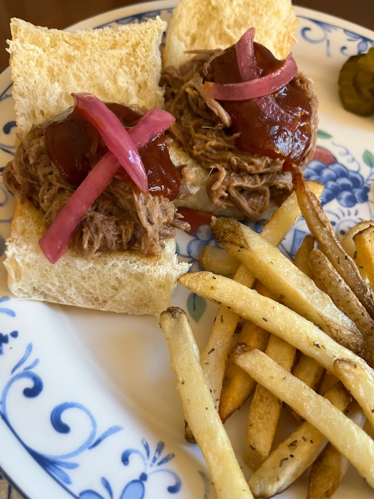 - Paula Deen’s BBQ Pork on Hawaiian Rolls/Oven Fries (I put a pork roast in the slow cooker along with the marinade listed in the recipe. I added a cup of chicken broth to keep the roast from drying out in the slow cooker.)