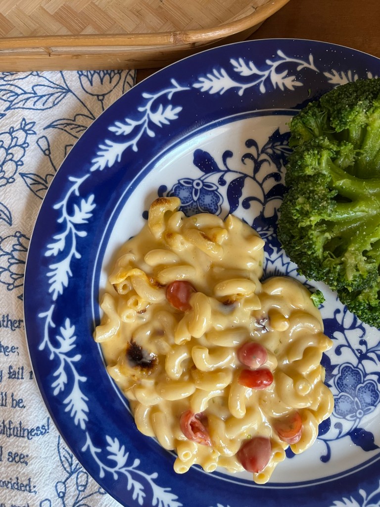 - Tomato Mac and Cheese/Broccoli (I did not bake the macaroni dish – I just added chopped cherry tomatoes to the pot on the stove. I don’t like baked mac & cheese.)