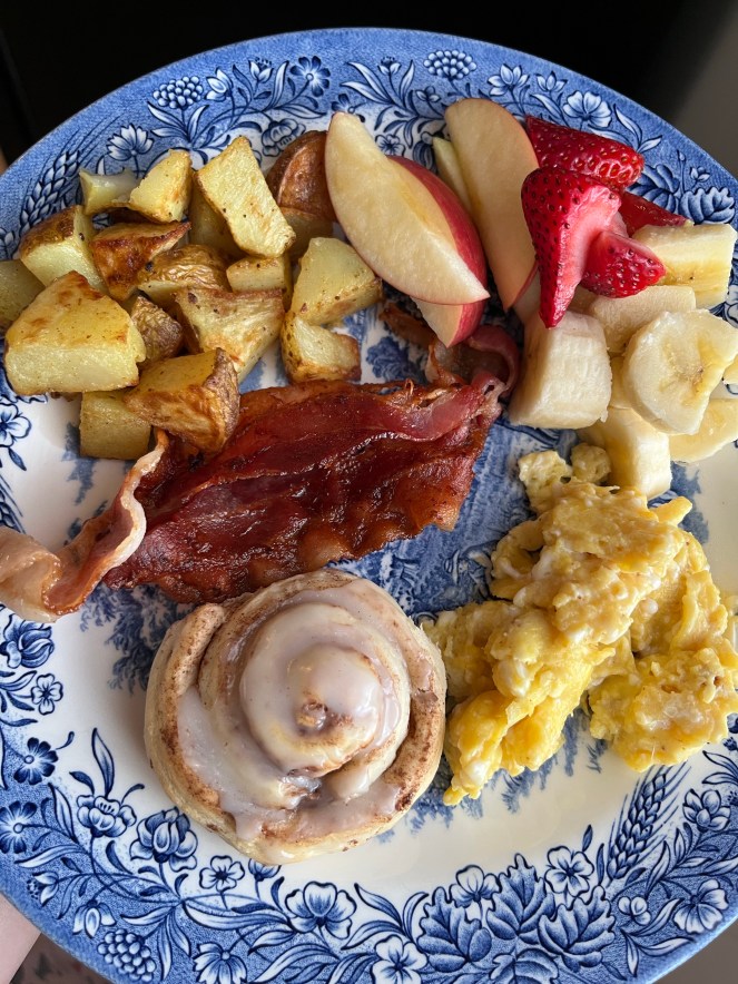 In the photo above, I balanced more expensive items like eggs and bacon with potatoes, fruit and cinnamon rolls (that I got inexpensively at Aldi).