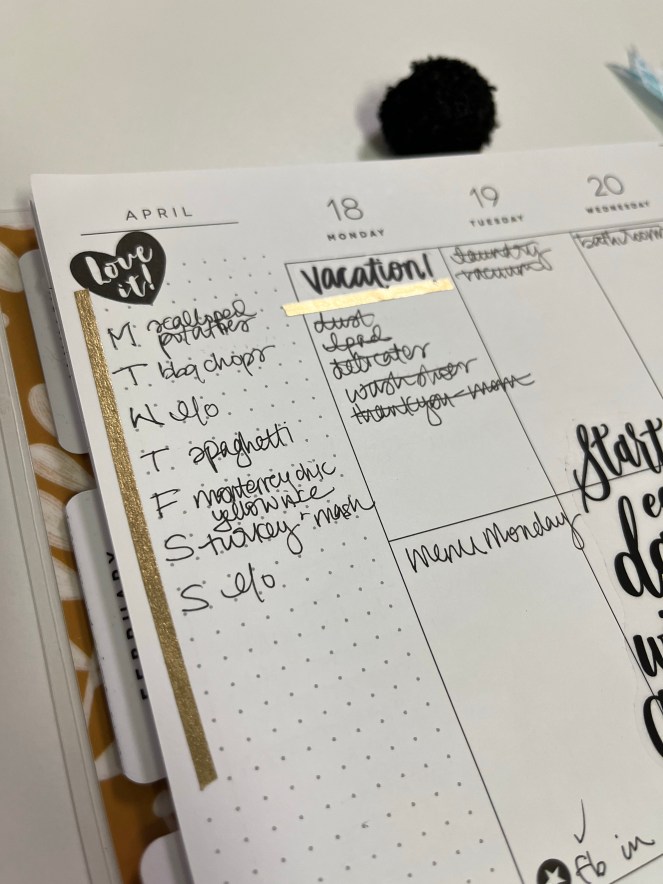 When I get home from the grocery store, I finish filling out my menu in my planner. Sometimes I have to rearrange or change meal ideas if the store is out of stock on certain things.