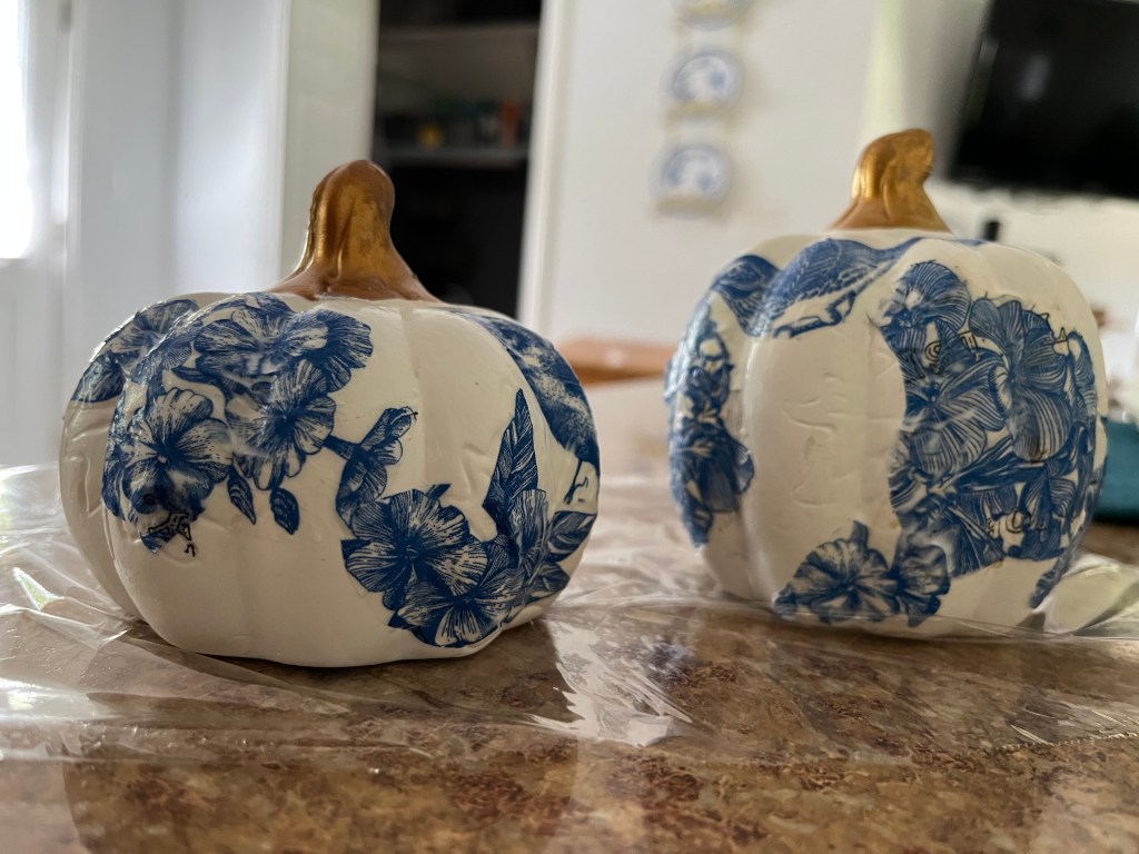 Last fall I really wanted a chinoiserie pumpkin, but I stuck with my no spend fall decor strategy and didn’t buy one. I decided to DIY one with some pretty napkins and mod podge on the plaster pumpkins I found at Dollar Tree.