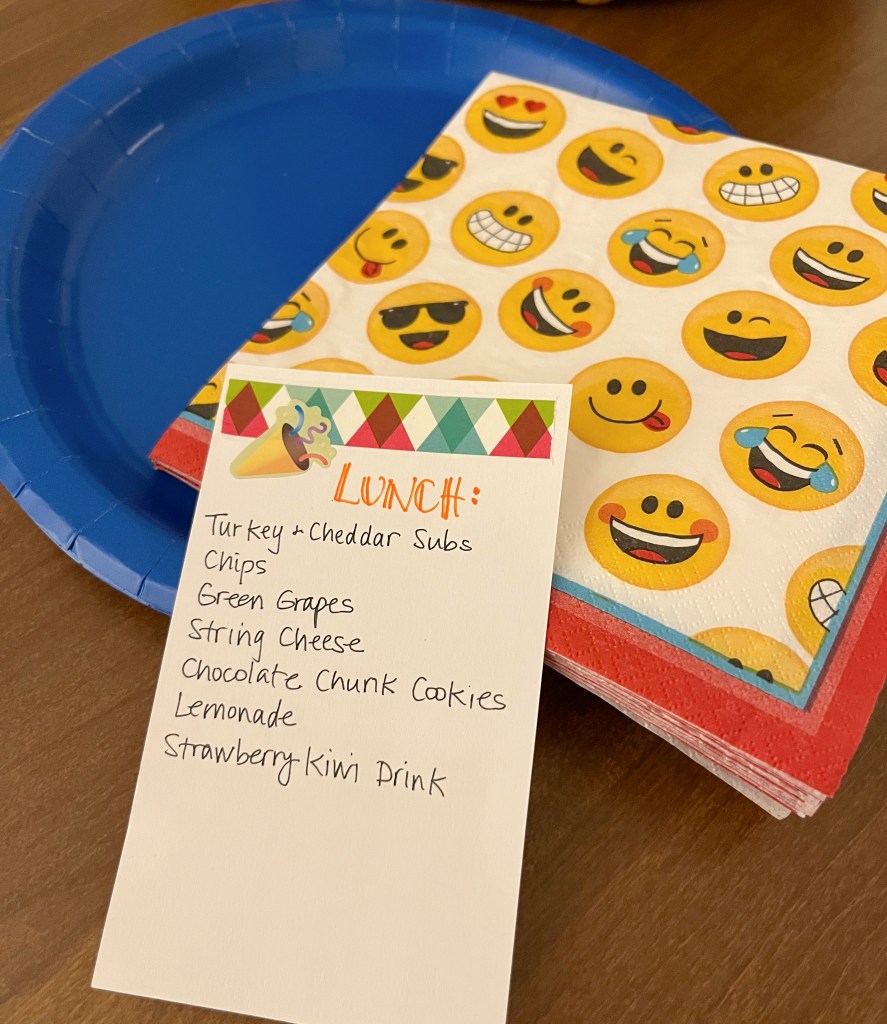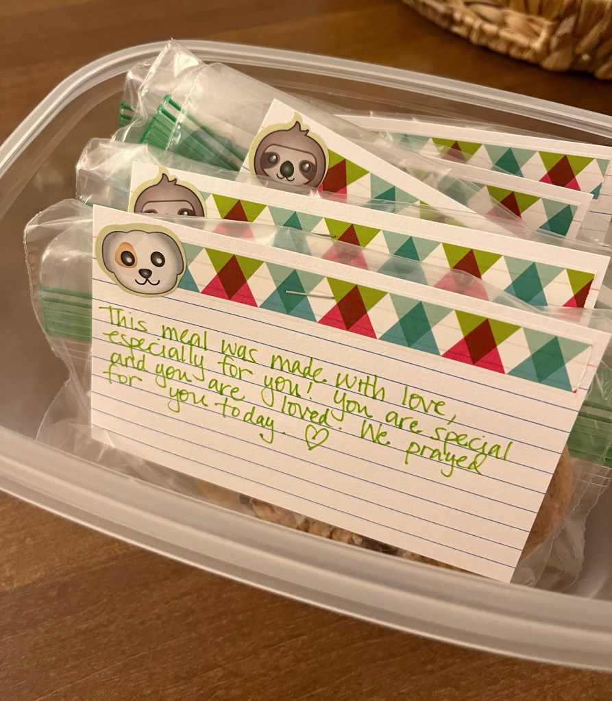 Any time I take food to people, I like to include pretty or fun paper products. Those emoji napkins came from Dollar Tree and I think they’re perfect! I made a bunch of these little notes to have on hand and always incorporate them into the dessert packaging, knowing that’s most likely to be eaten. 🙂