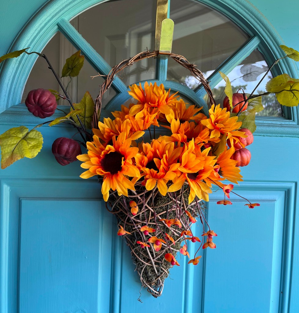 2. I love your fall decor. It’s simple but beautiful! I have a similar wall floral holder on my front porch only mine is metal not a basket. I found I could take a wooden cut out (like a heart for Valentine’s Day) add a magnet to it and attach it to the metal holder. It’s fun to change for the seasons!