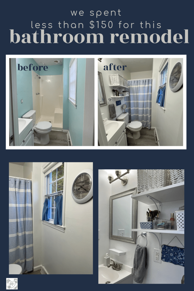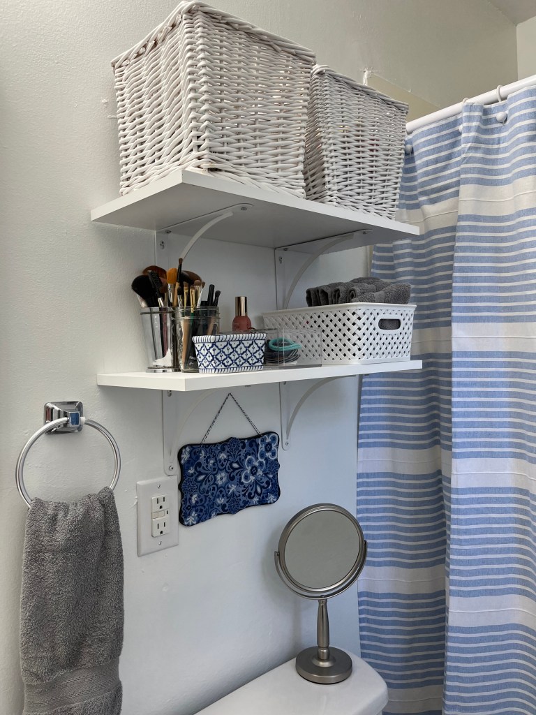 I shopped my house for the blue and white accents, including the curtains which are cloth napkins. I had the curtain ring clips on hand but you can find them at Lowes or on Amazon. Everything else is the same from our first project in this room 5 years ago – fixtures, mirror and shelving. Total spent: less than $145!