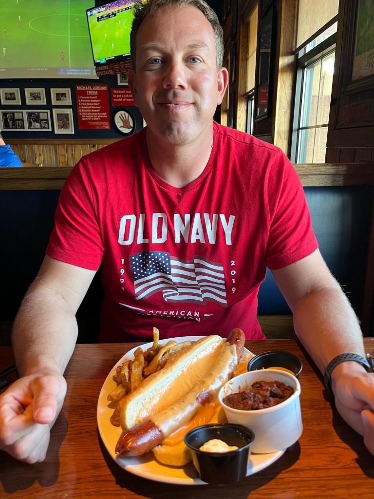 There was a Carolina Ale House (one of our favorites!) near our hotel, and while we’ve eaten there many times Paul has somehow never ordered their foot long hot dog. Maybe it’s new on the menu, but at any rate it was a hit!