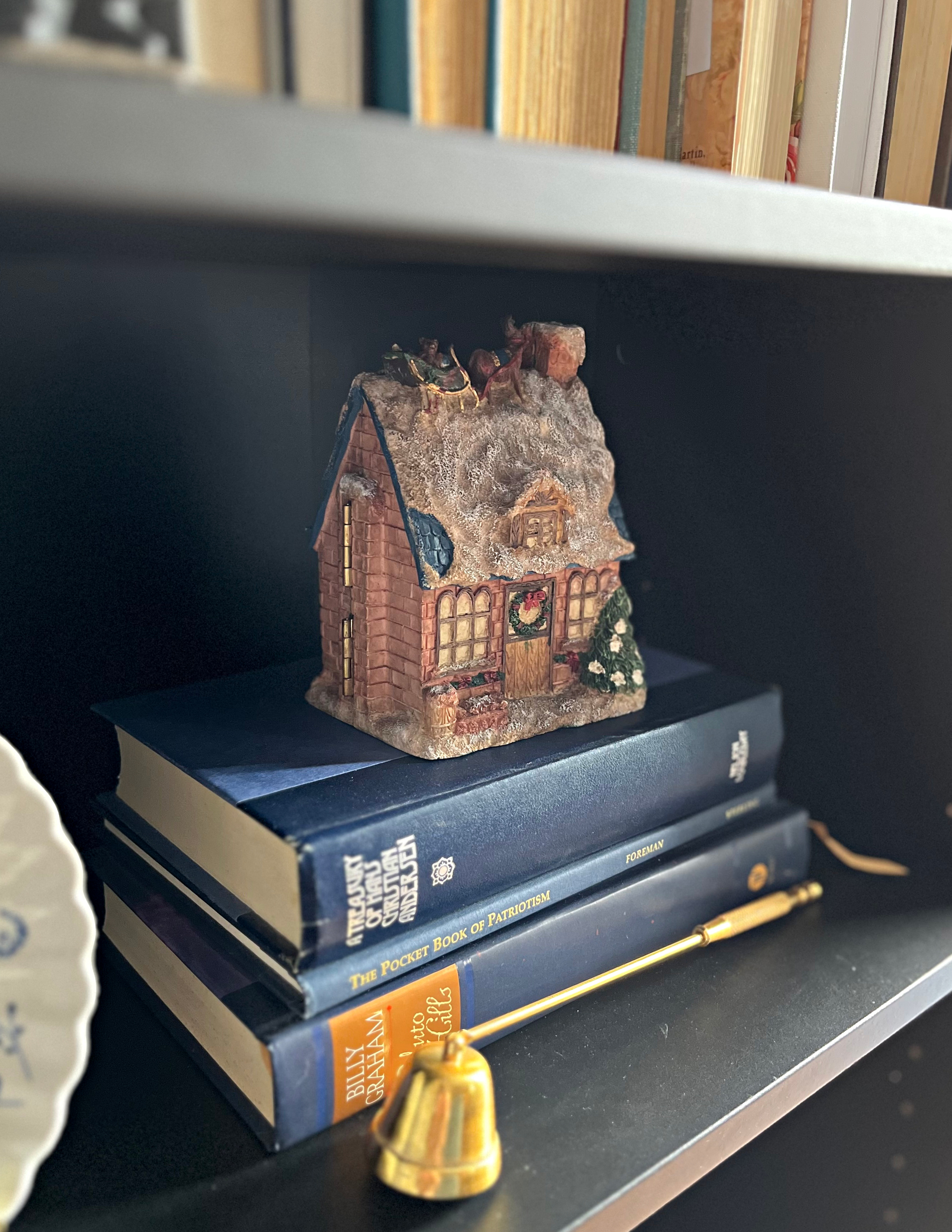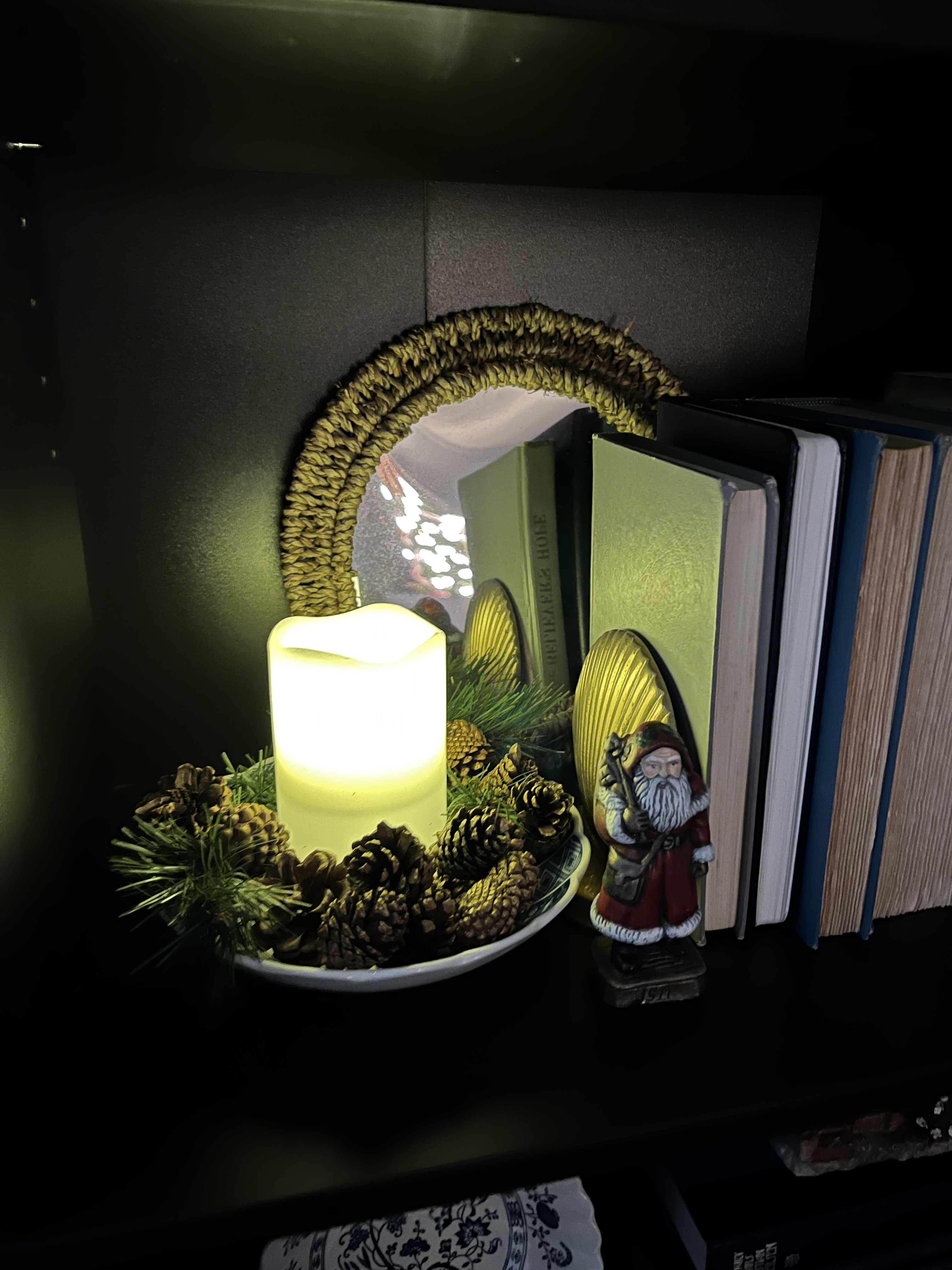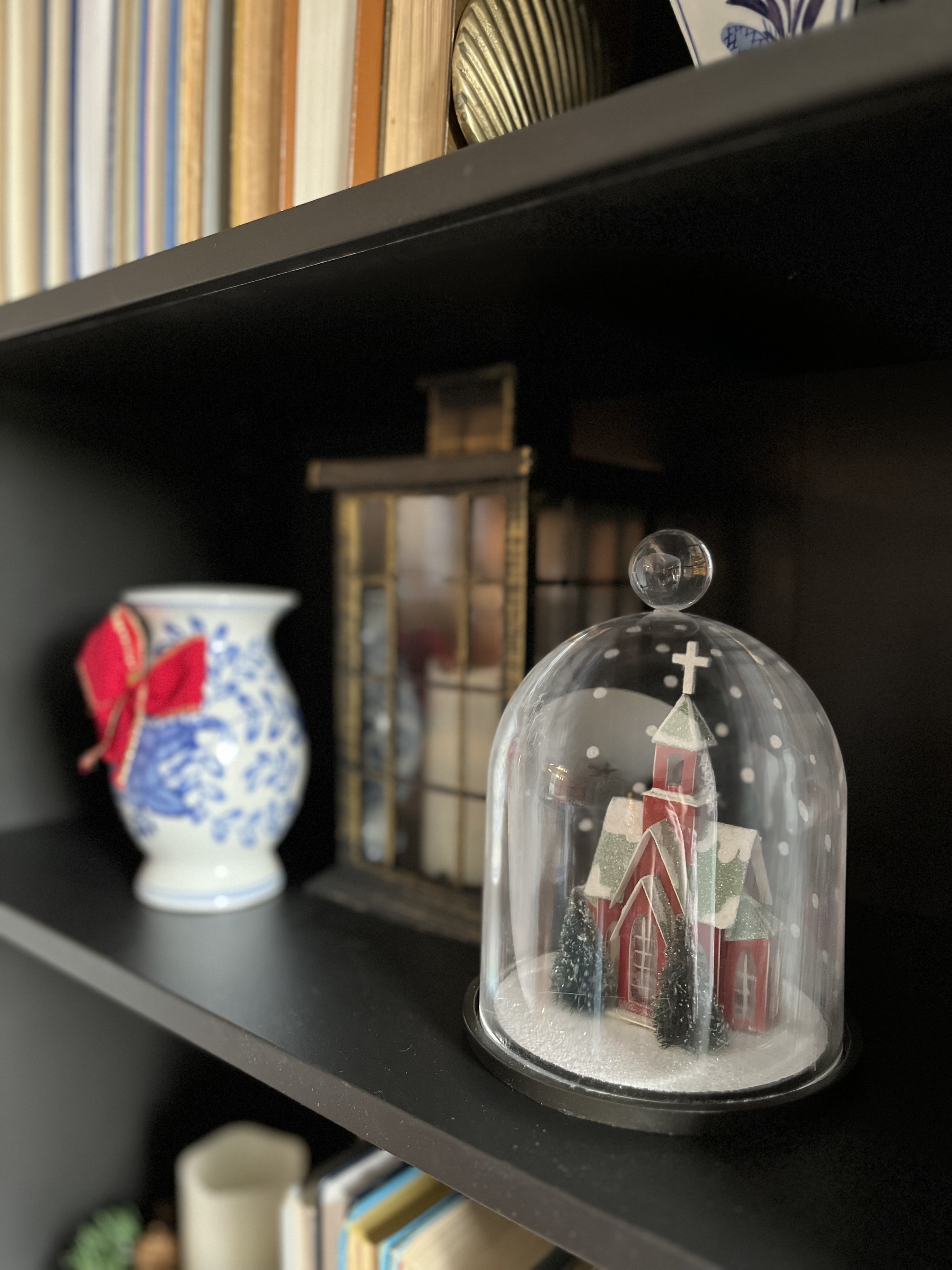 One of my favorite things about Christmas decor is noticing the reflection of Christmas lights throughout the house. I love how the tree lights are reflected in the mirror on my bookshelf!