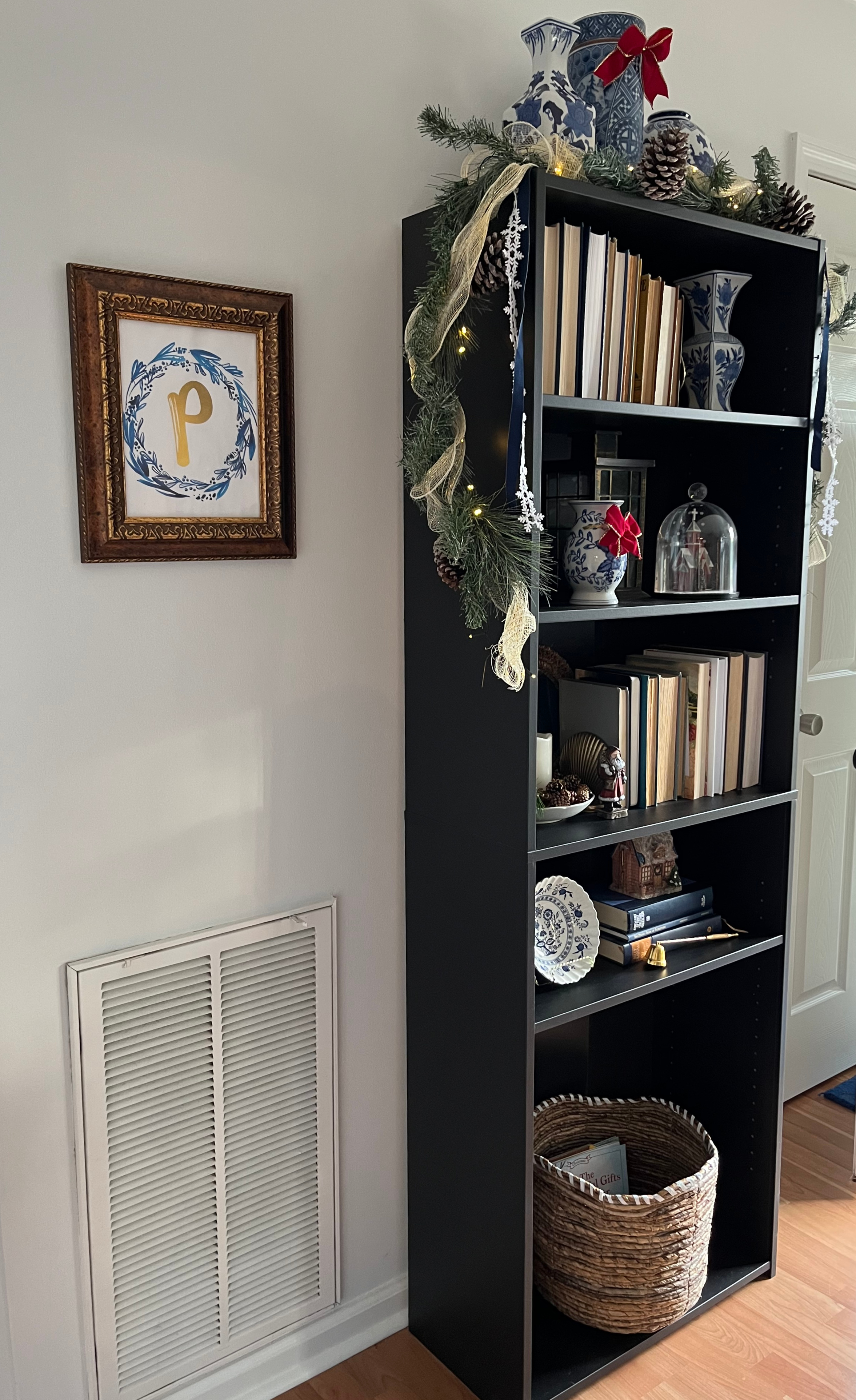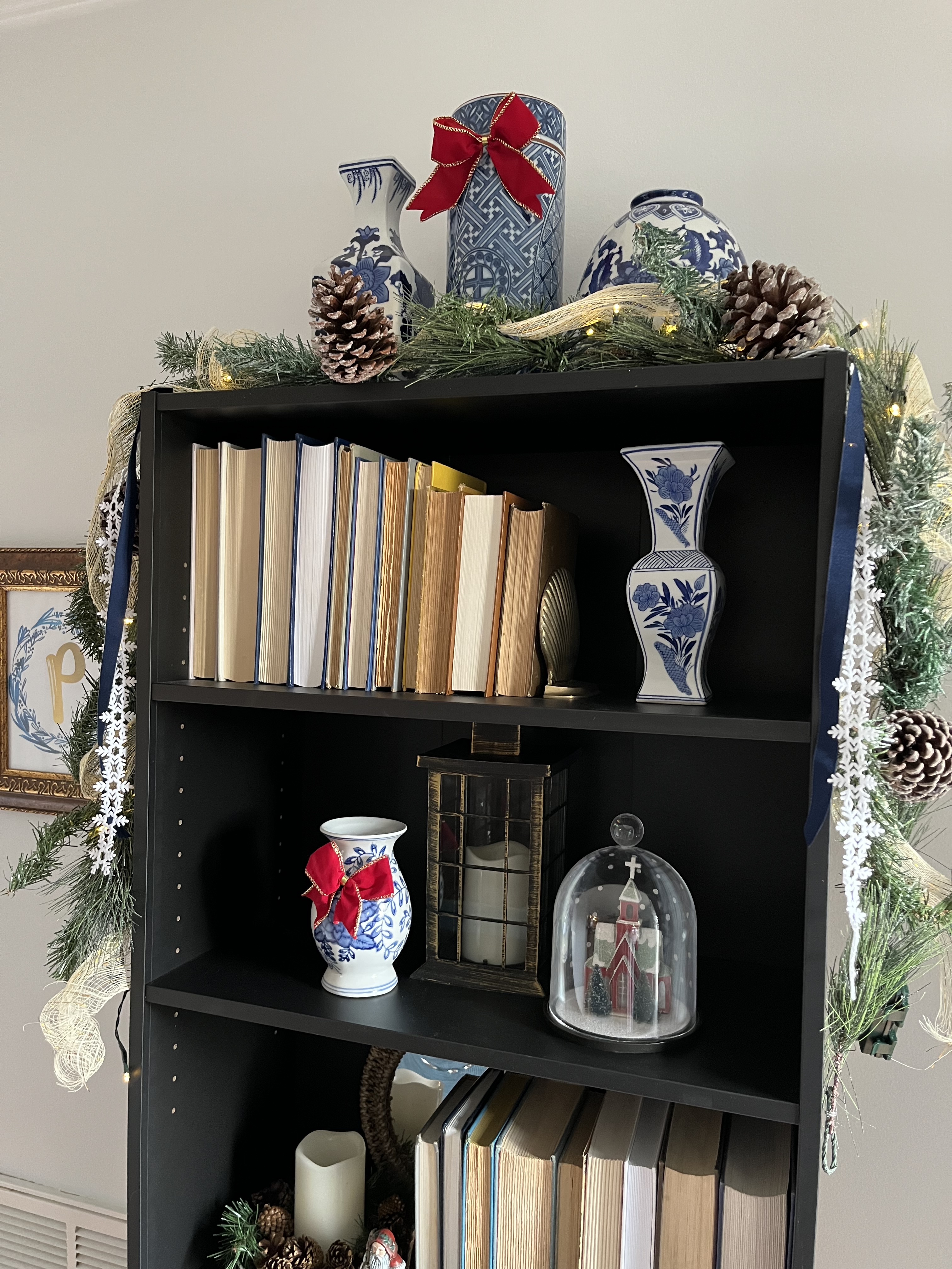 I use the bookshelf as my “mantle.” This spot is my favorite of the season!