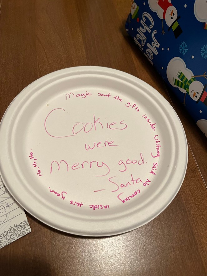 The first plate of cookies for Santa and a note reassuring little ones that Santa did not come in the house.