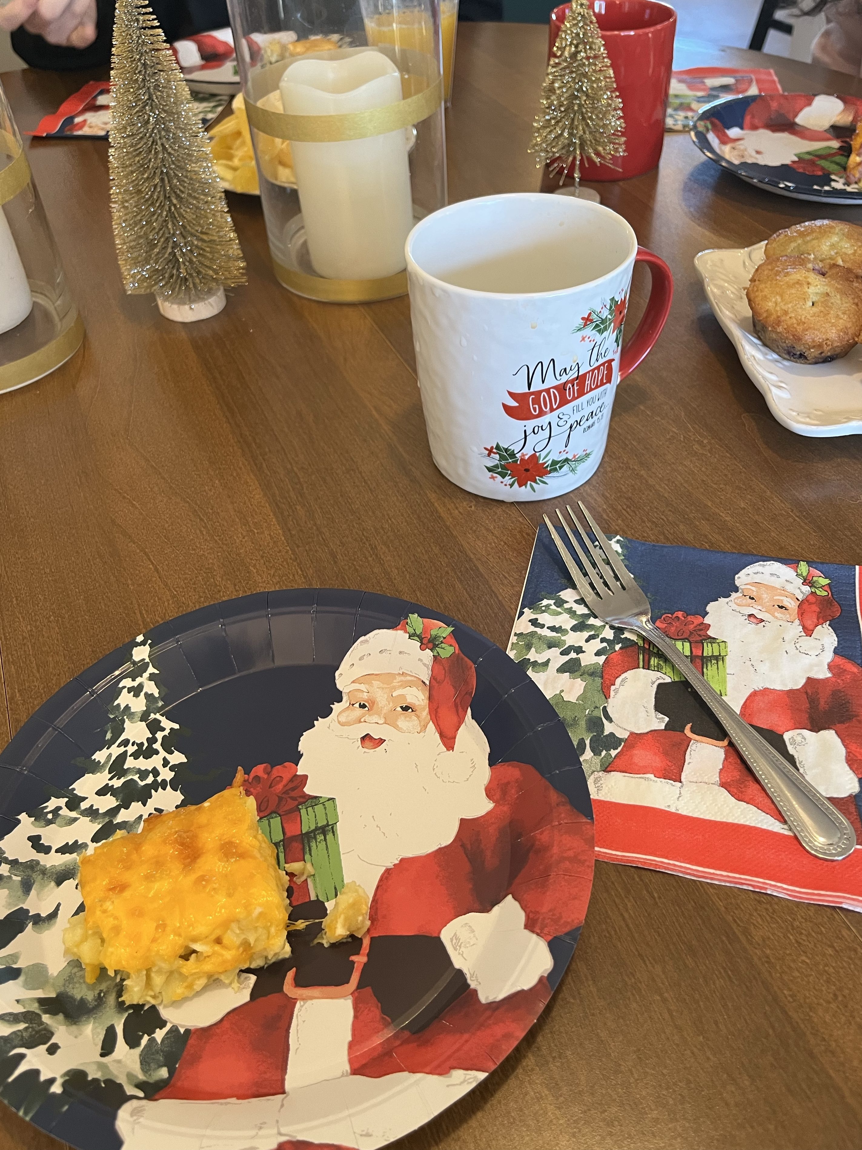 Christmas morning with breakfast, gifts from Santa, and lots of trash bags.