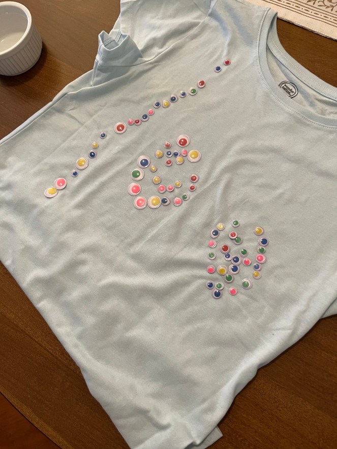 100 googly eyes hot glued on a shirt for 100 days of K5.