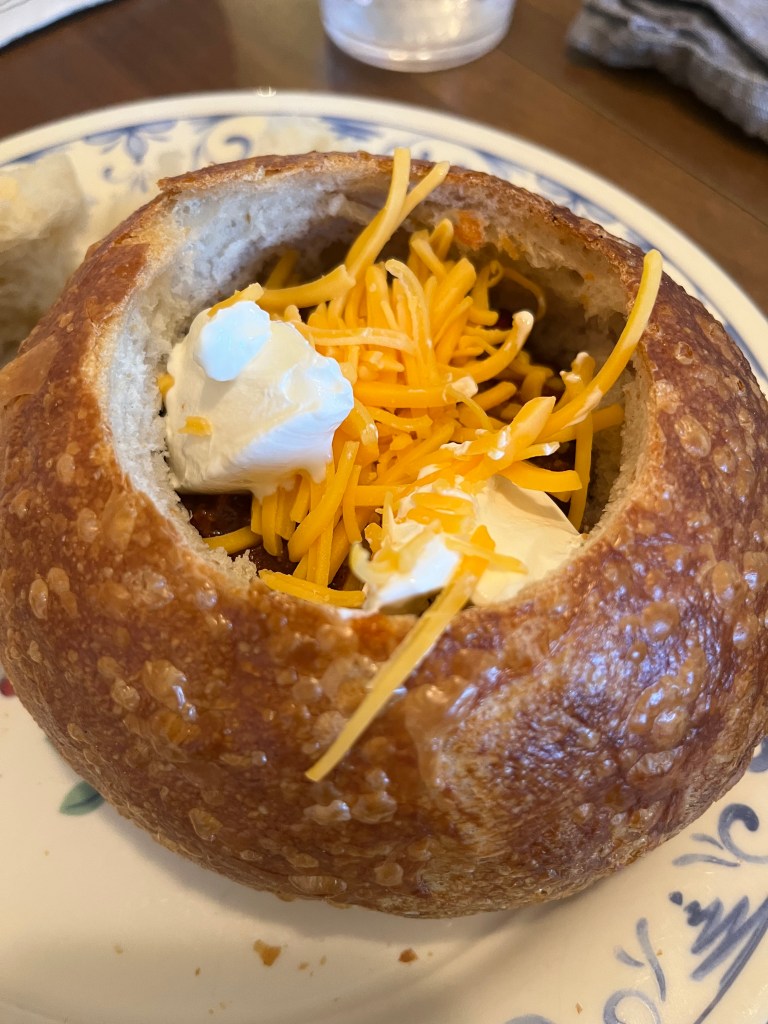 Homemade Chili/Bread Bowls from Panera (such a fun idea!)/Chili Toppings: Cheese, Sour Cream/Grapes/Salted Peanut Butter and M&M Cookies