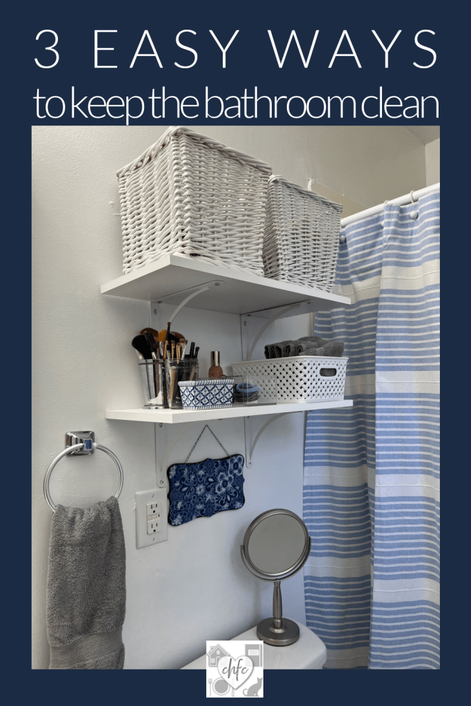 I keep Lysol wipes under the sink in both bathrooms. Each day after I finish getting ready, I wipe the sink, counter, and toilet seat lid. It goes a long way in helping the bathroom to look fresh and clean.