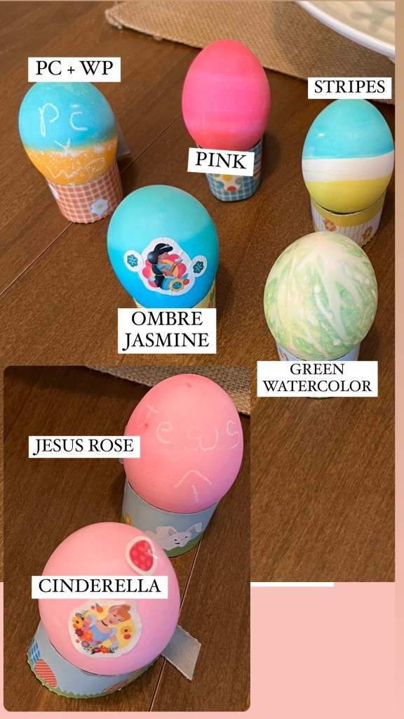 I really wanted to create some fun memories at Easter. We dyed eggs on Saturday – thanks to everyone on Instagram who voted in our contest! The winner ended up being our middle kiddos’ green watercolor with Paul’s striped egg coming in second.