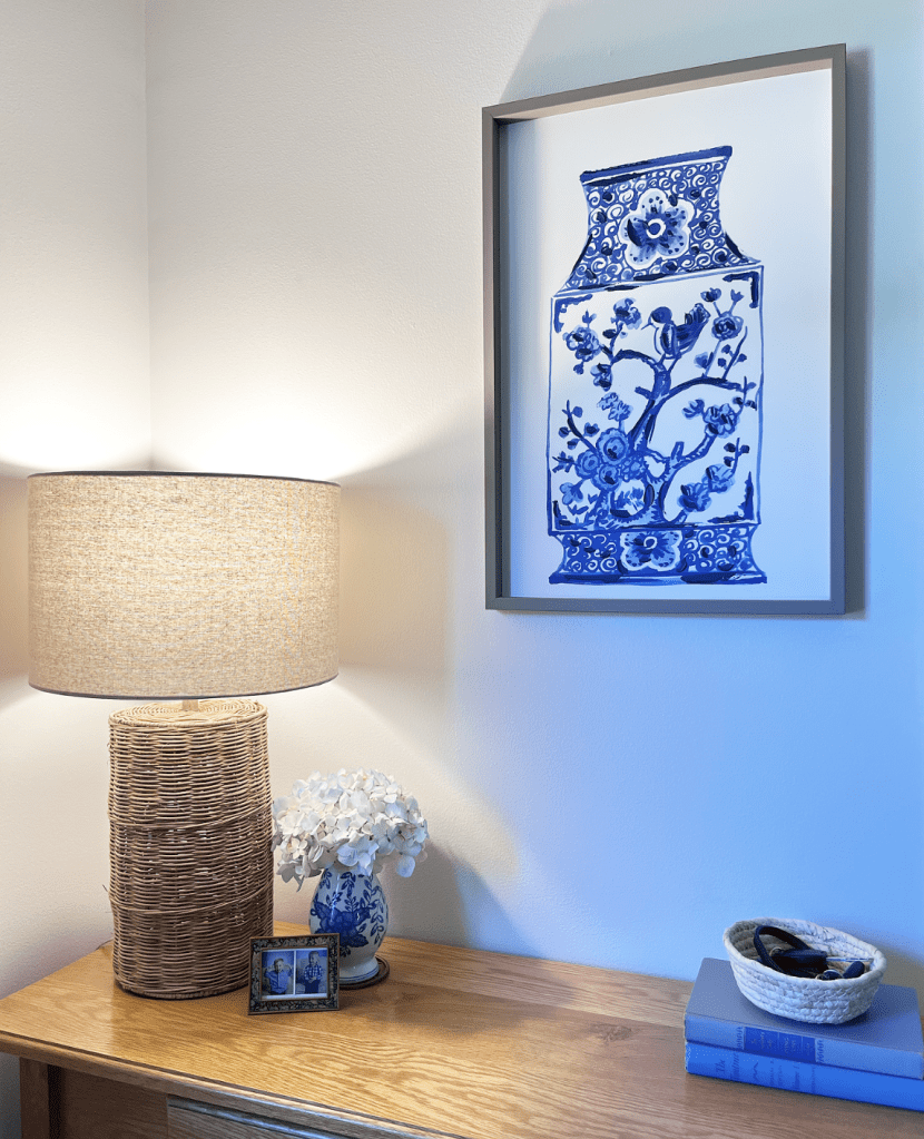 Here you can see how I styled the basket. It’s not very large or heavy, so the books underneath keep it in place.