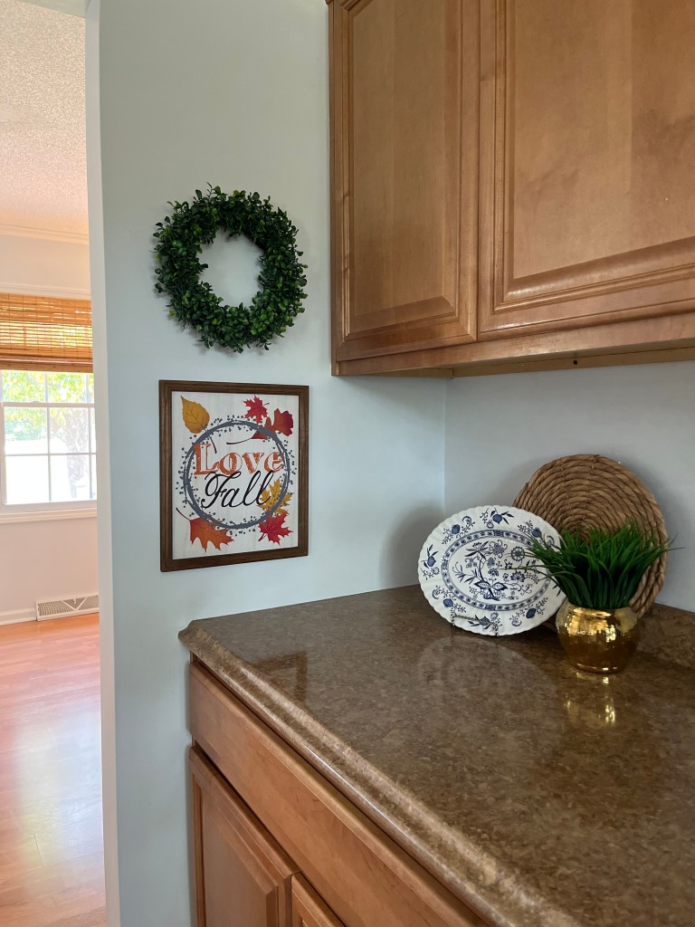 I really try to limit the amount of decor with words because it can end up looking cluttered and tacky, but I just love this old “Hello Fall” sign from Target’s dollar spot circa 2016.