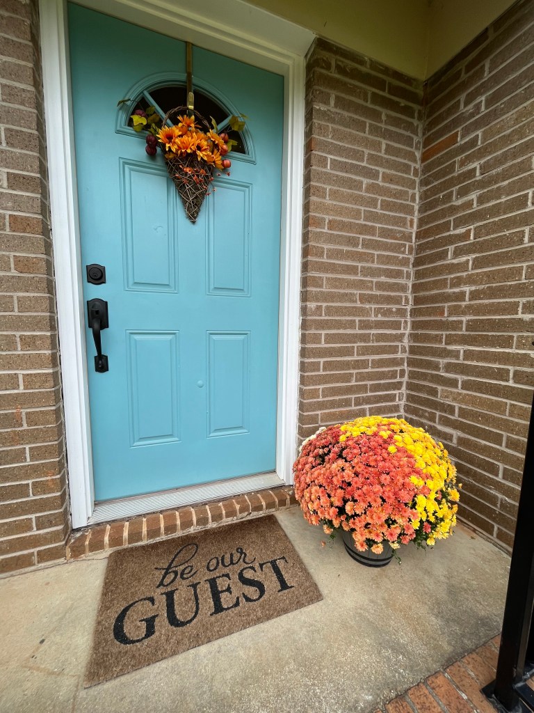 Here’s a picture of my front door from last fall. I added the outdoor decor last year after I shared my fall tour, so I’ll sneak it into this year’s post. I did the same thing on our front door this year, it’s just too hot to add mums yet.