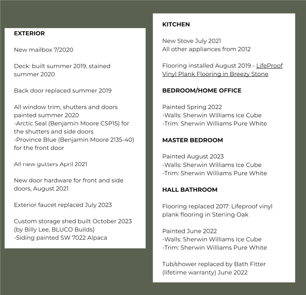 List each room in your house. Walk through the room, writing down as much as you can remember about the updates you’ve made over the years. Look at your Instagram feed or camera roll for clues to when things were updated. Don’t stress about getting all the details, just fill in what you can.