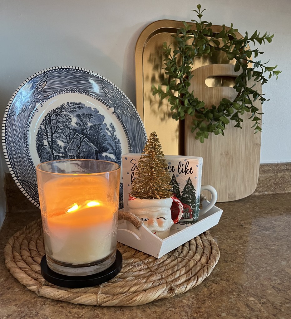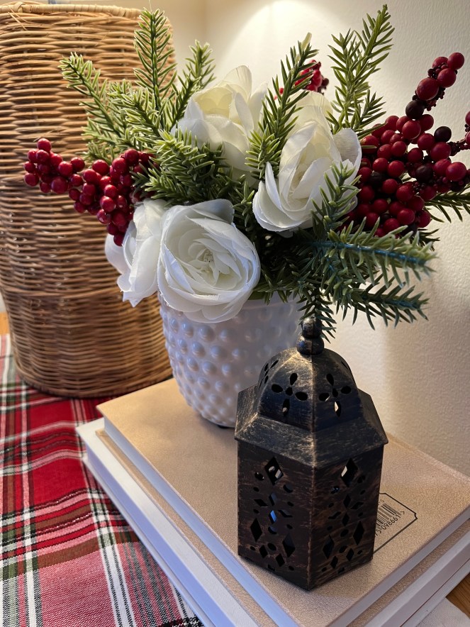 When you’re decorating a vignette like your entry table, you don’t want every item on the table to be straight Christmas décor. Things can end up looking cold, cluttered, and maybe even a little tacky.
