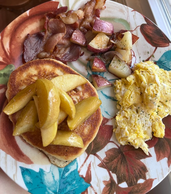 - Pancakes, Bacon, Scrambled Eggs, Roasted Potatoes, Fried Apples