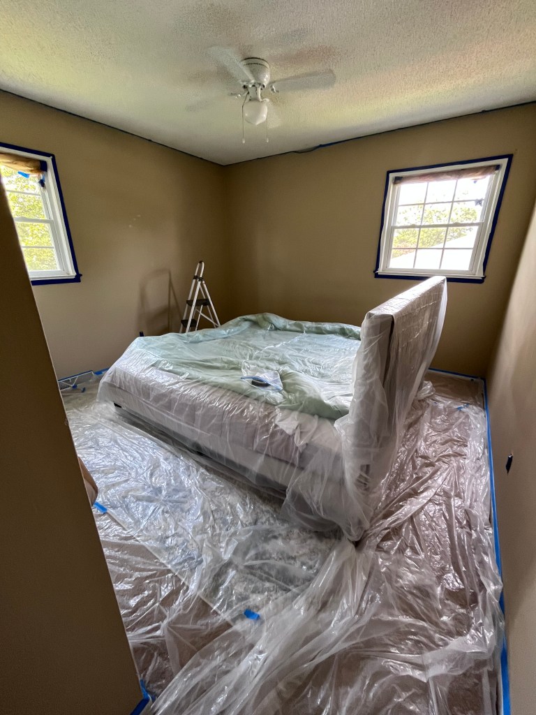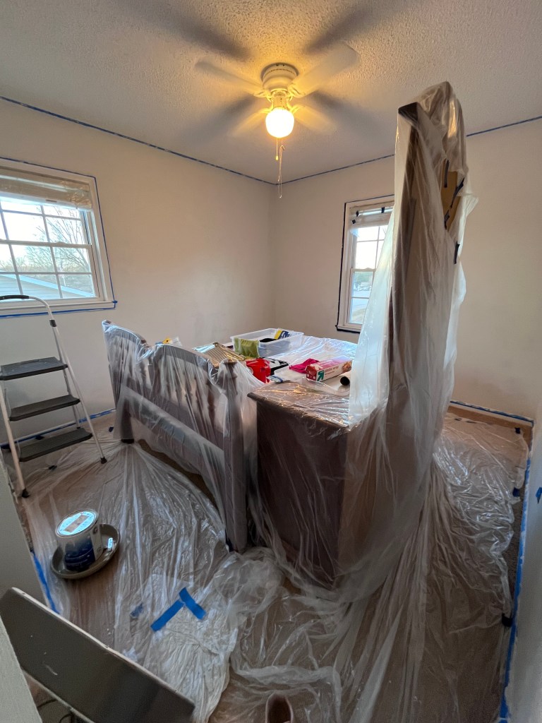 5 – Cover all remaining furniture, blinds, and floor with drop cloths. I like the plastic ones from Dollar Tree.